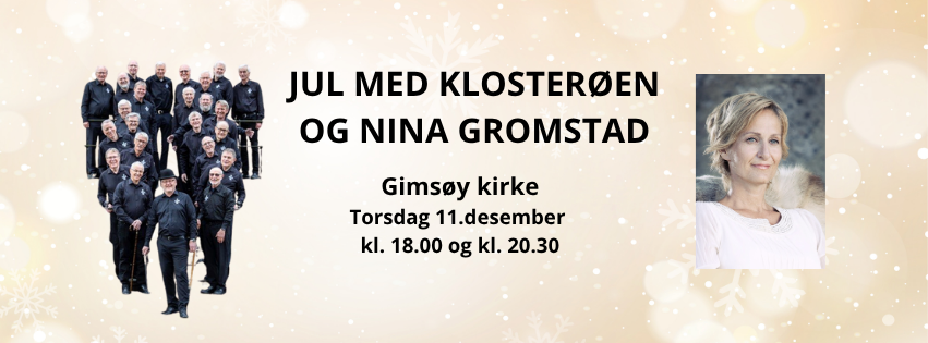 Velkommen til JUL MED KLOSTERØEN, Klosterøen og Scheensvassdraget Spadser og Mandssangforening Torsdag 11. desember kl 18.00 og 20.30 Årets gjeste solist: Nina Gromstad