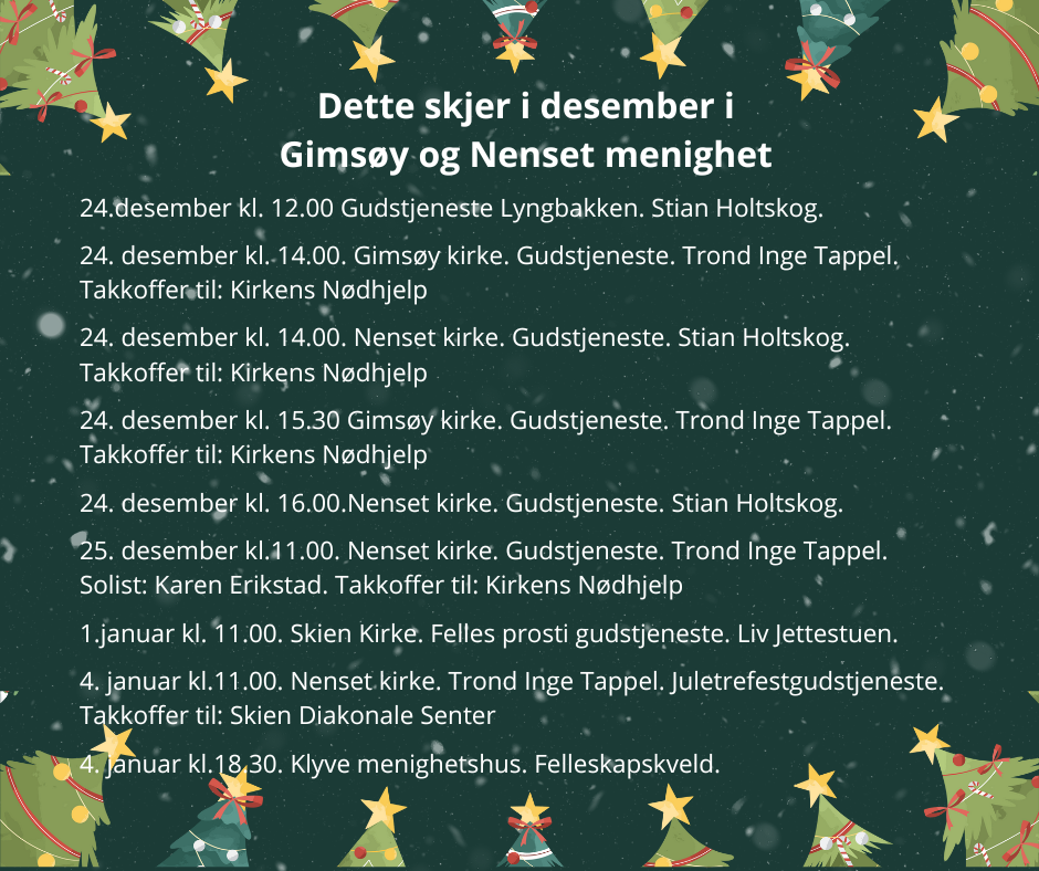 24. desember kl. 15.30 Gimsøy kirke. Gudstjeneste. Trond Inge Tappel. Takkoffer til: Kirkens Nødhjelp